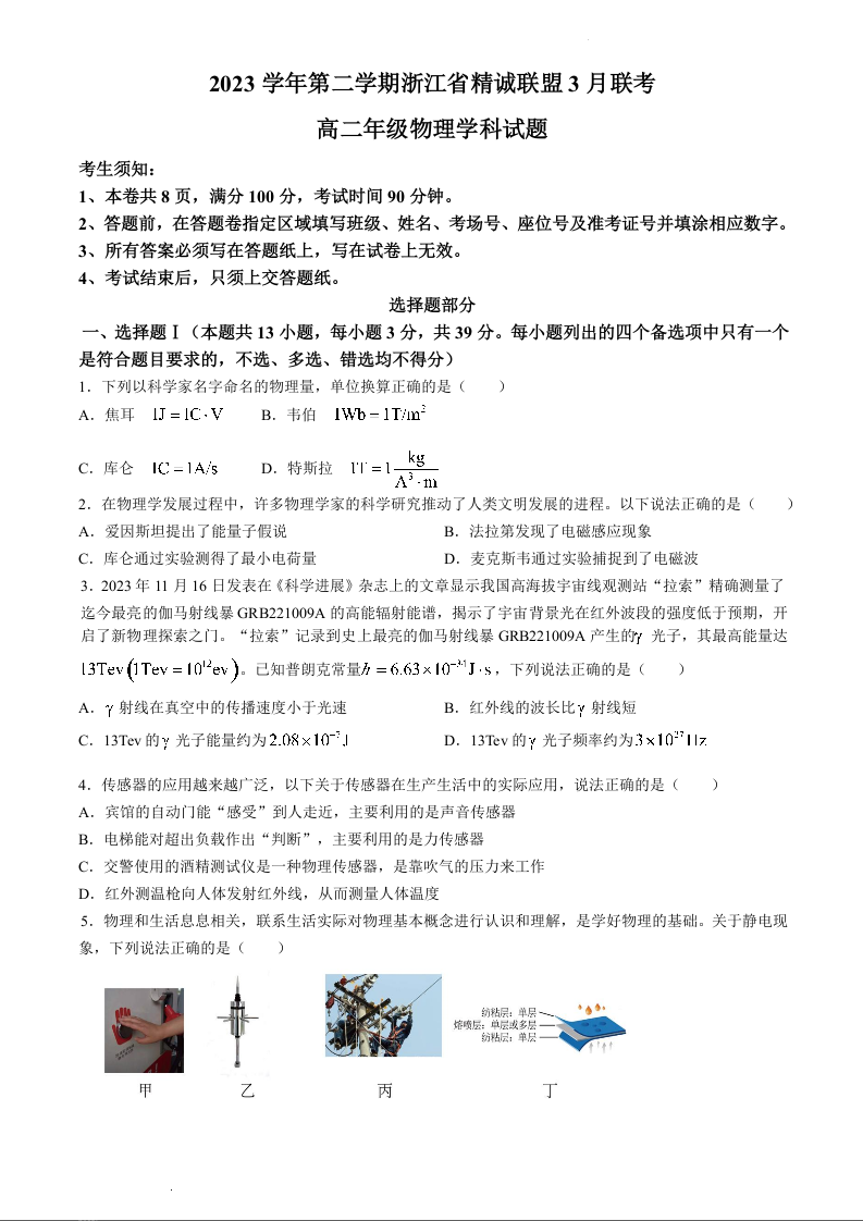 浙江省精诚联盟2023-2024学年高二下学期3月联考物理+答案