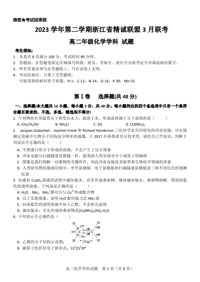 浙江省精诚联盟2023-2024学年高二下学期3月联考化学