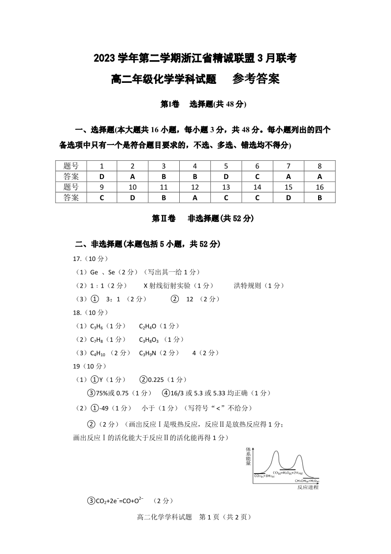 浙江省精诚联盟2023-2024学年高二下学期3月联考化学答案