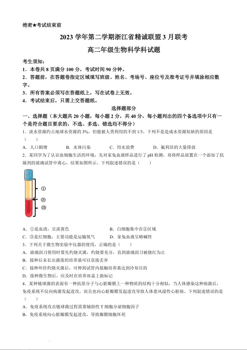 浙江省精诚联盟2023-2024学年高二下学期3月联考生物+答案