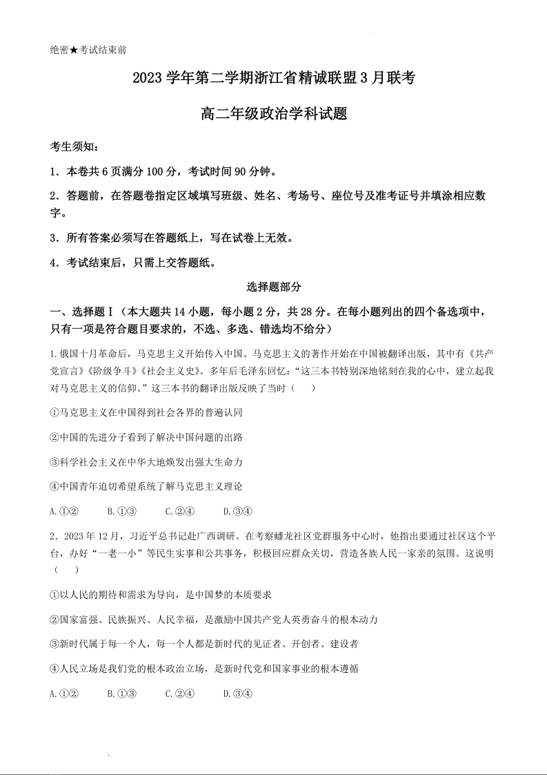浙江省精诚联盟2023-2024学年高二下学期3月联考政治+答案