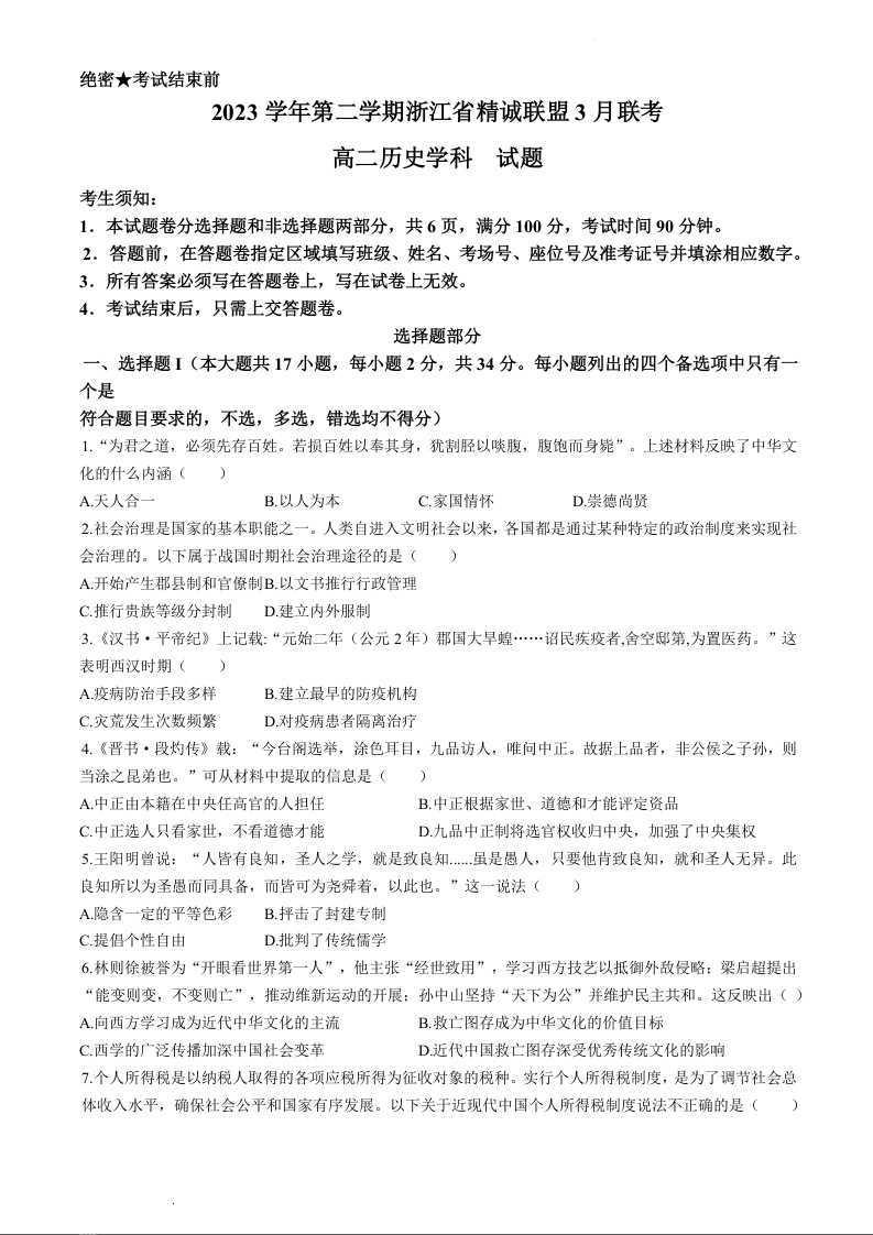 浙江省精诚联盟2023-2024学年高二下学期3月联考历史+答案