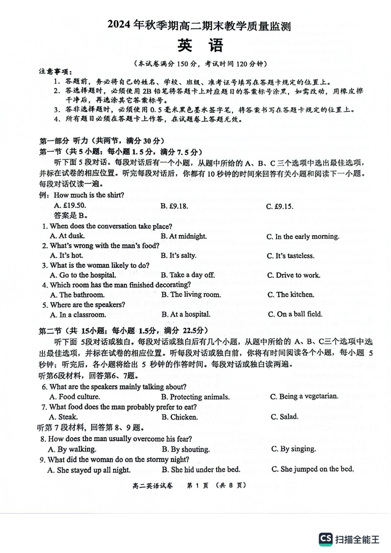 广西壮族自治区玉林市2024-2025学年高二上学期1月期末考试英语