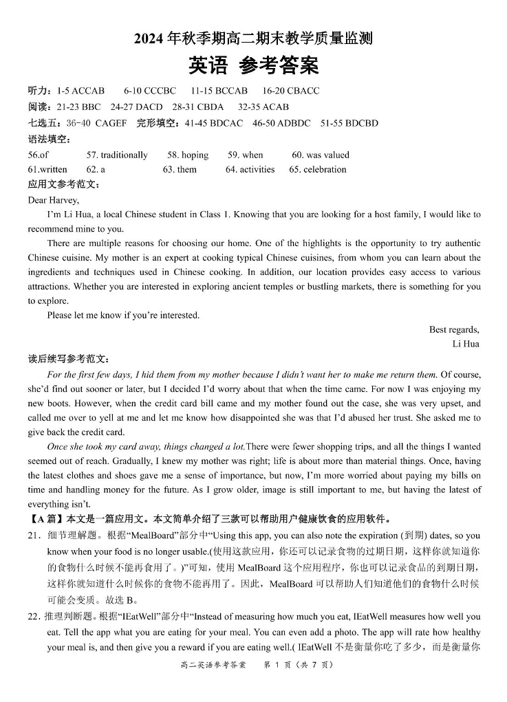 广西壮族自治区玉林市2024-2025学年高二上学期1月期末考试英语答案