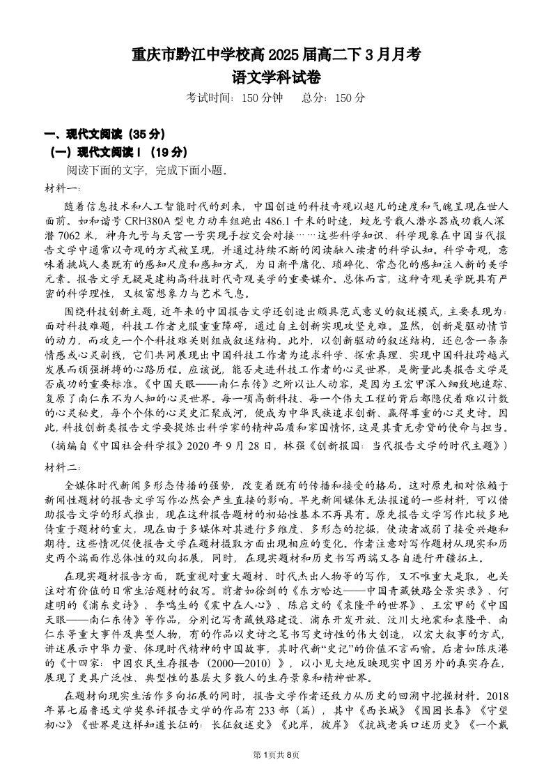 重庆市黔江区黔江中学校2023-2024学年高二下学期3月月考语文