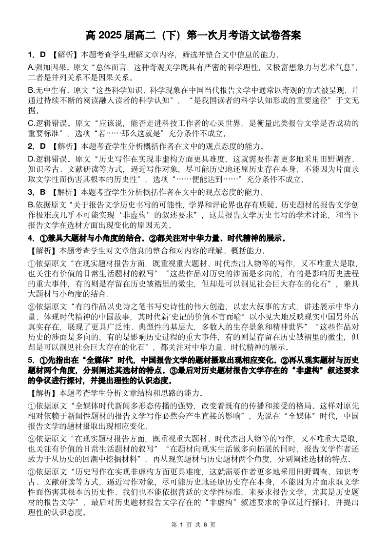 重庆市黔江区黔江中学校2023-2024学年高二下学期3月月考语文答案