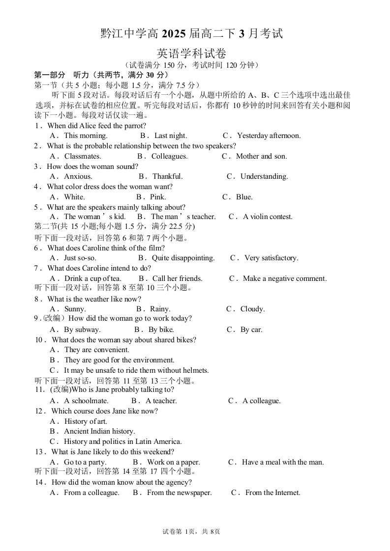 重庆市黔江区黔江中学校2023-2024学年高二下学期3月月考英语