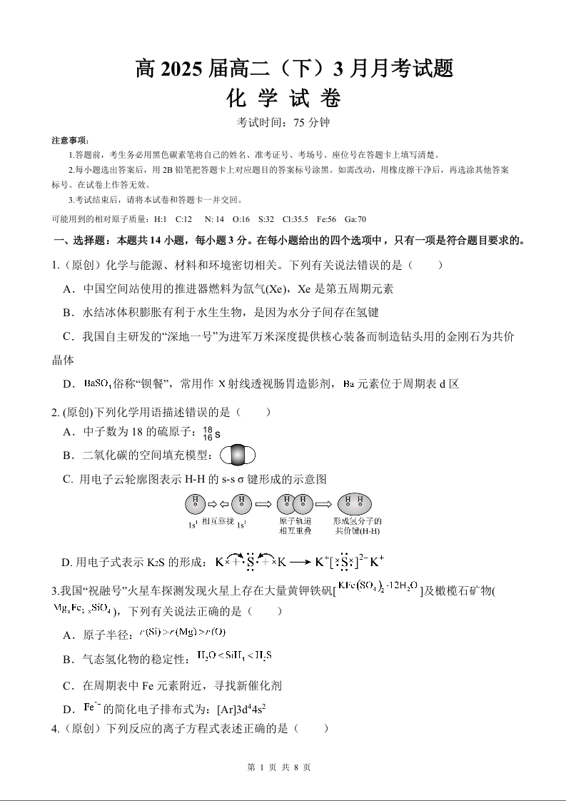 重庆市黔江区黔江中学校2023-2024学年高二下学期3月月考化学