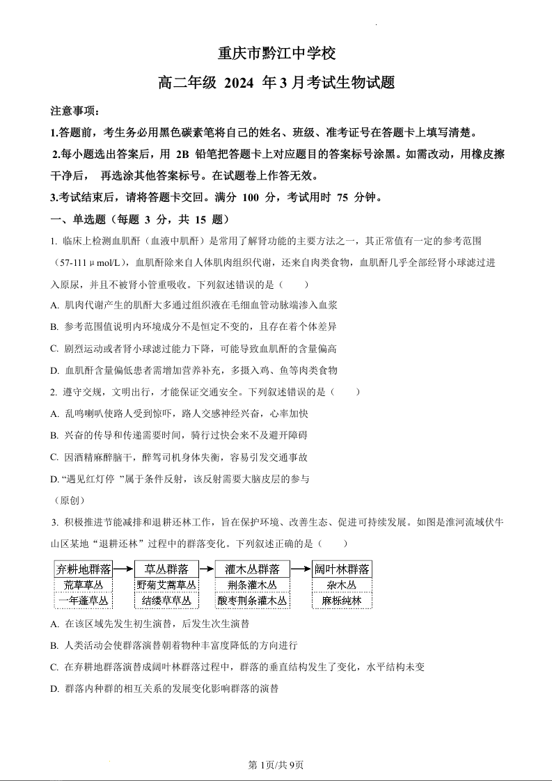 重庆市黔江区黔江中学校2023-2024学年高二下学期3月月考生物(原卷版)
