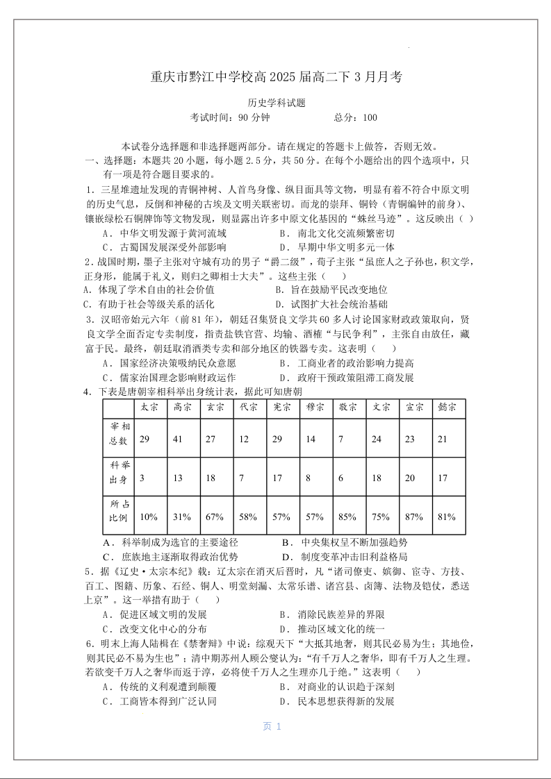 重庆市黔江区黔江中学校2023-2024学年高二下学期3月月考历史