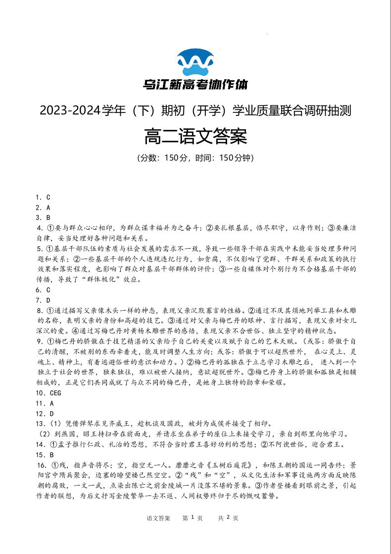 重庆市乌江新高考协作体2023-2024学年高二下学期开学学业质量联合调研抽测语文答案