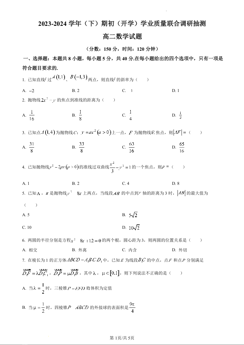 重庆市乌江新高考协作体2023-2024学年高二下学期开学学业质量联合调研抽测数学(原卷版)