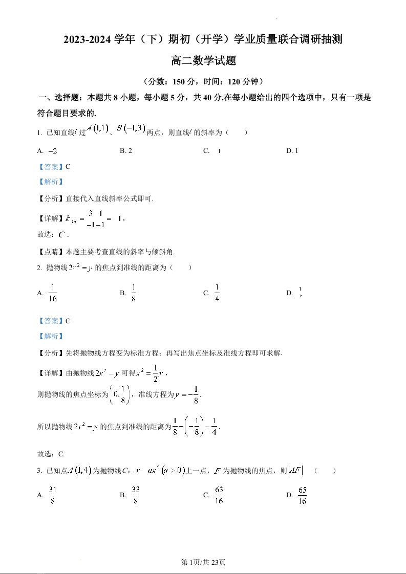 重庆市乌江新高考协作体2023-2024学年高二下学期开学学业质量联合调研抽测数学(精品解析版)