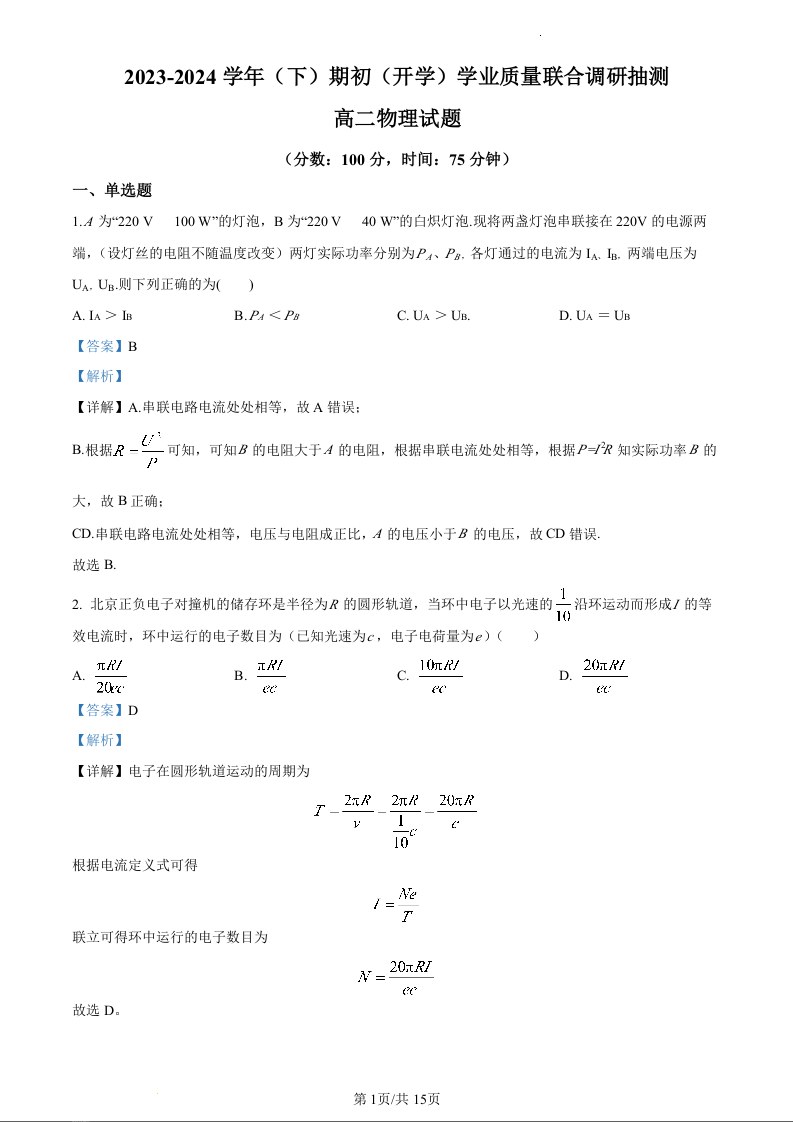 重庆市乌江新高考协作体2023-2024学年高二下学期开学学业质量联合调研抽测物理(精品解析版)