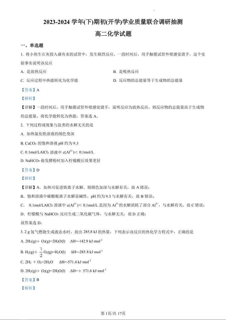 重庆市乌江新高考协作体2023-2024学年高二下学期开学学业质量联合调研抽测化学(精品解析版)