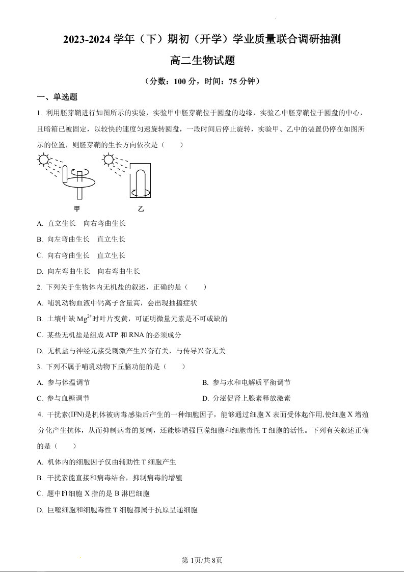重庆市乌江新高考协作体2023-2024学年高二下学期开学学业质量联合调研抽测生物(原卷版)