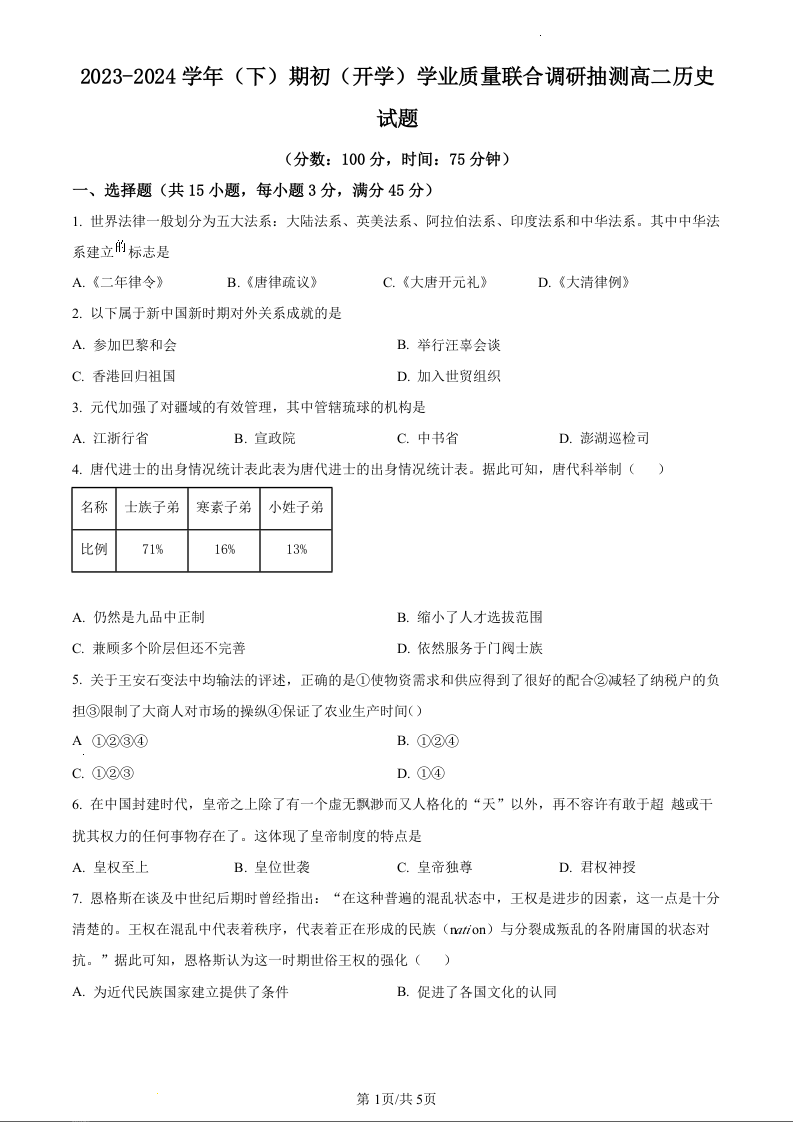重庆市乌江新高考协作体2023-2024学年高二下学期开学学业质量联合调研抽测历史(原卷版)