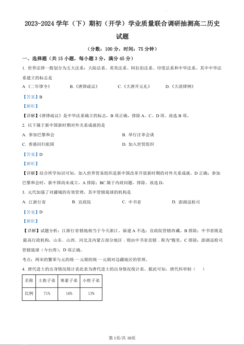 重庆市乌江新高考协作体2023-2024学年高二下学期开学学业质量联合调研抽测历史(精品解析版)