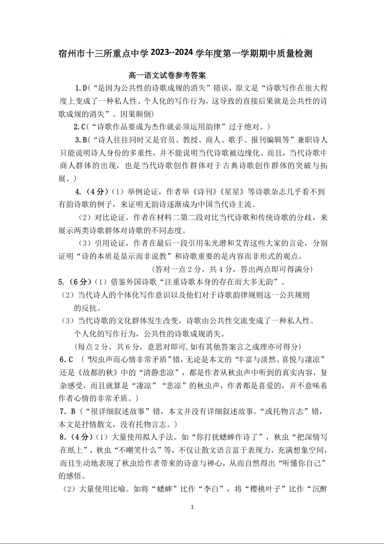 安徽省宿州市十三校联考2023-2024学年高一上学期期末考试语文答案