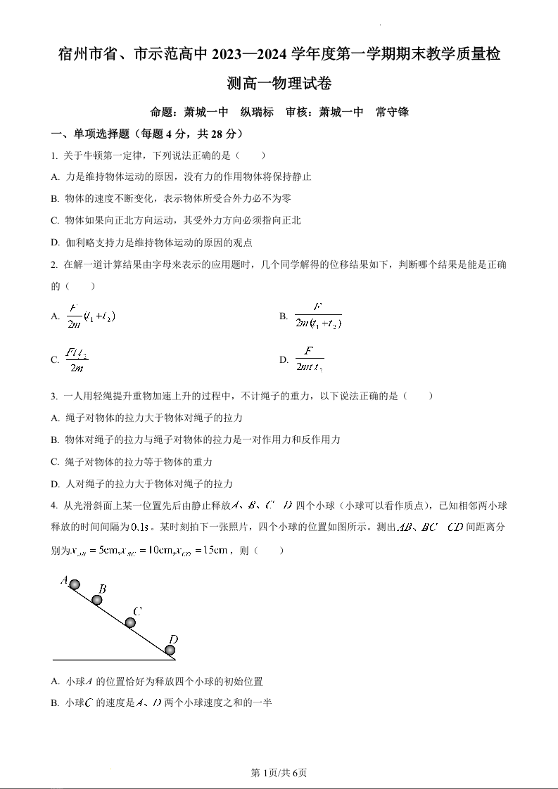 安徽省宿州市十三校联考2023-2024学年高一上学期期末考试物理(原卷版)