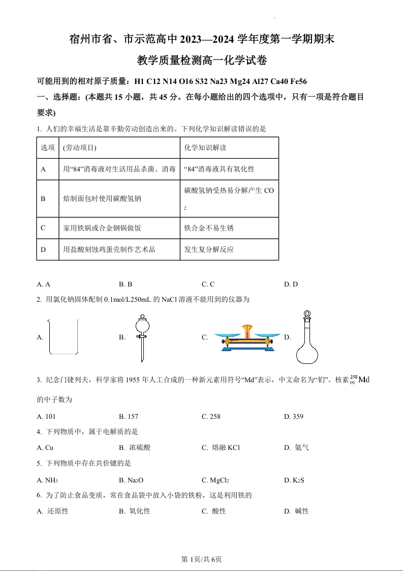 安徽省宿州市十三校联考2023-2024学年高一上学期期末考试化学(原卷版)