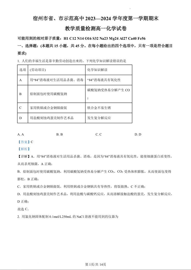 安徽省宿州市十三校联考2023-2024学年高一上学期期末考试化学(精品解析版)