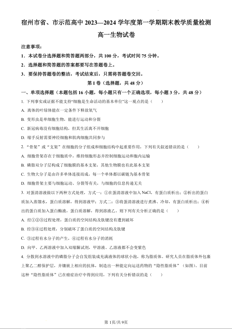 安徽省宿州市十三校联考2023-2024学年高一上学期期末考试生物(原卷版)