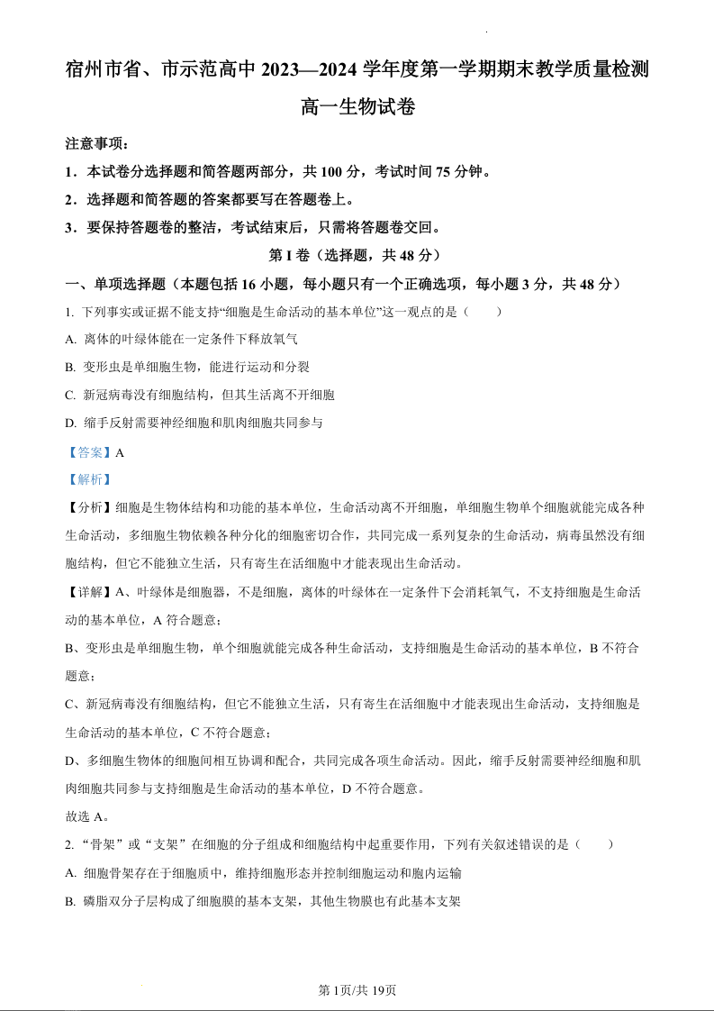 安徽省宿州市十三校联考2023-2024学年高一上学期期末考试生物(精品解析版)