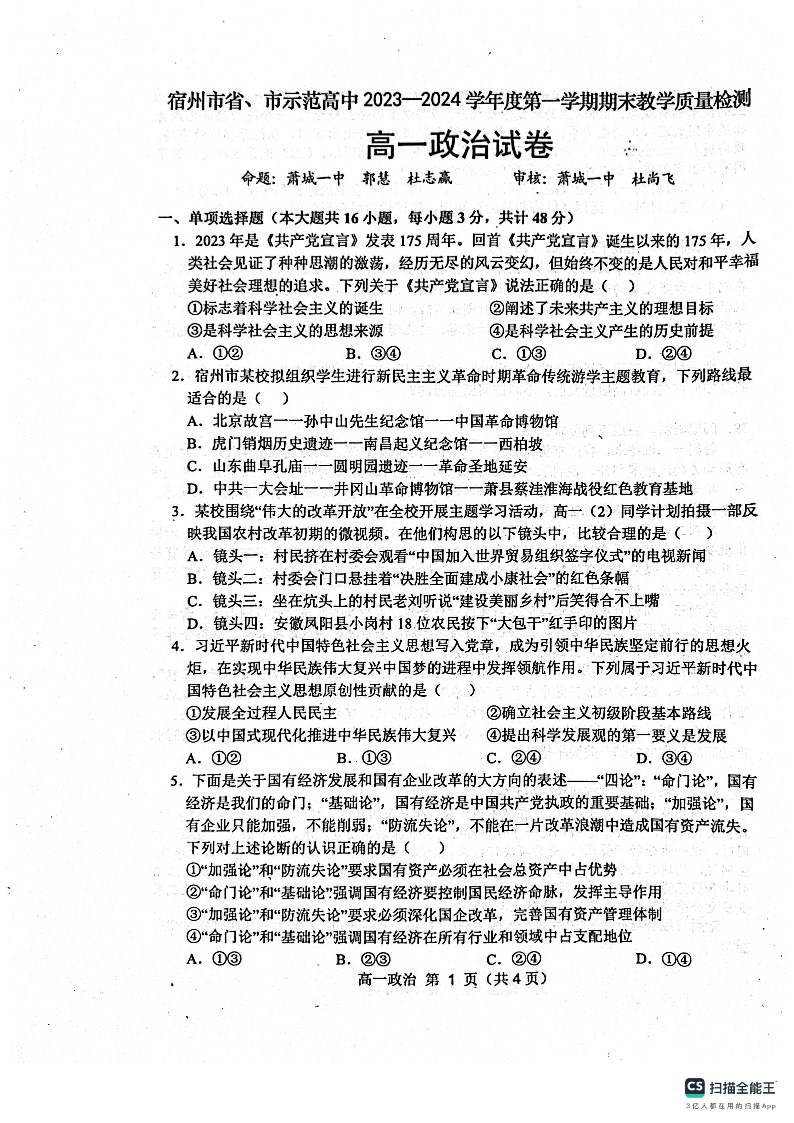 安徽省宿州市十三校联考2023-2024学年高一上学期期末考试政治