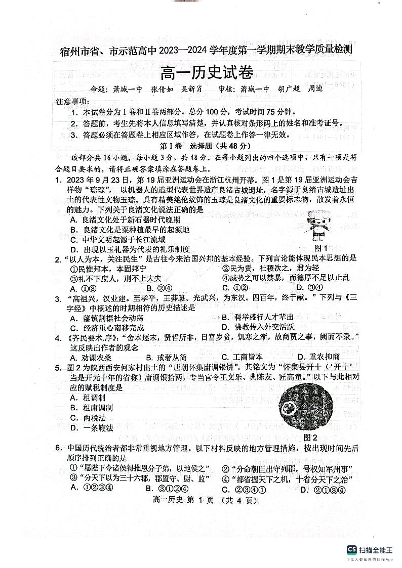 安徽省宿州市十三校联考2023-2024学年高一上学期期末考试历史