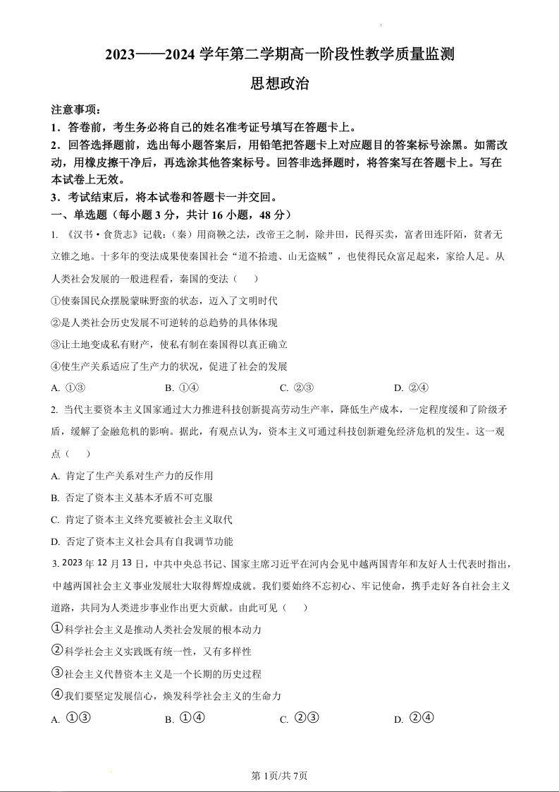 安徽省安徽师范大学附属中学2023-2024学年高一下学期3月月考政治(原卷版)