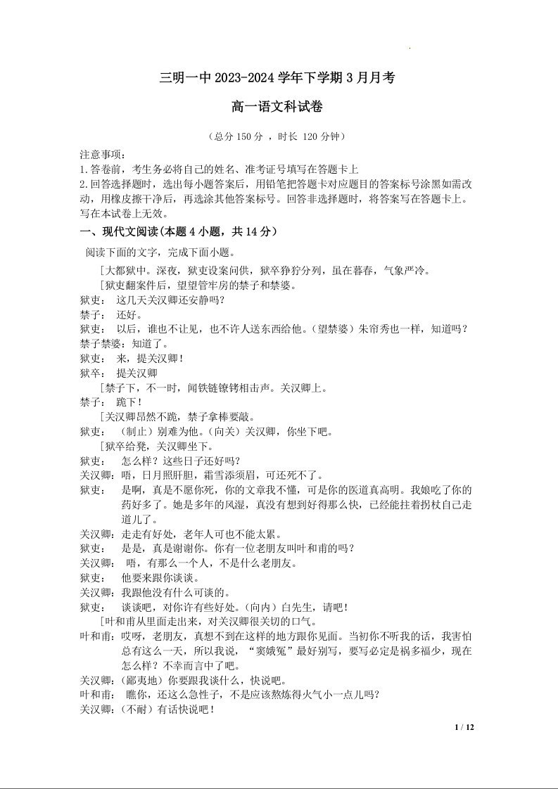 福建省三明市第一中学2023-2024学年高一下学期3月月考语文
