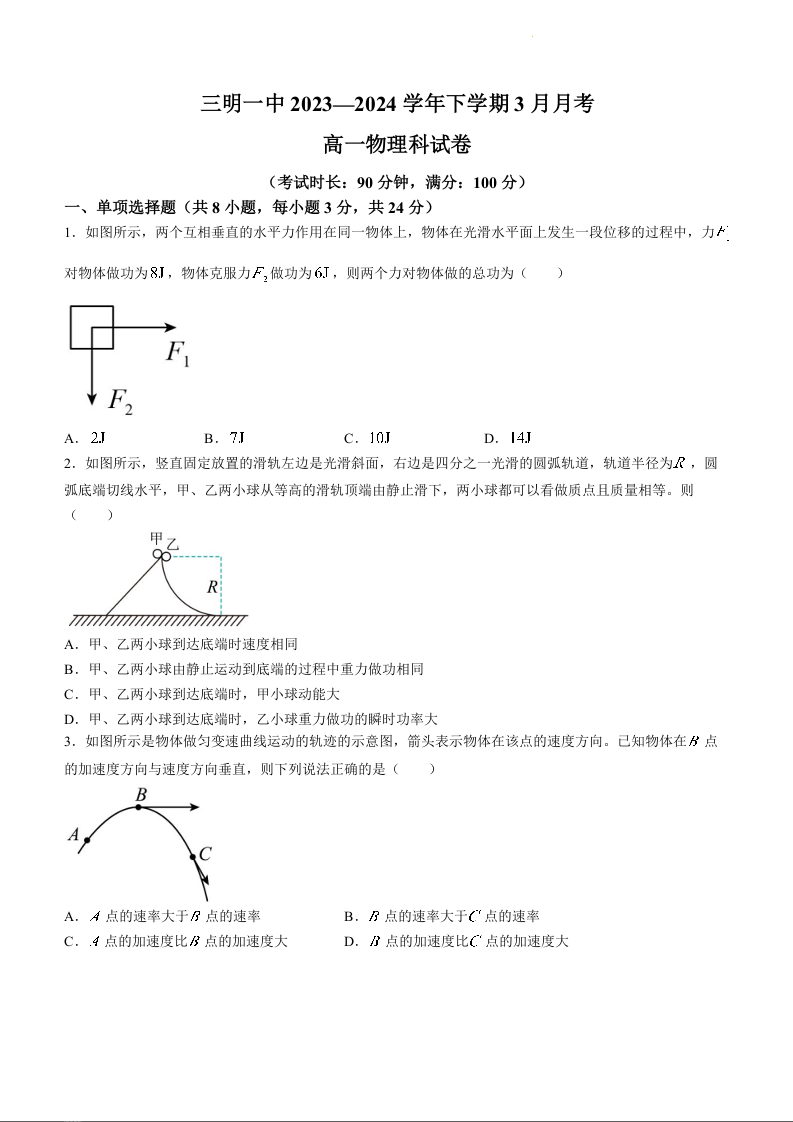 福建省三明市第一中学2023-2024学年高一下学期3月月考物理