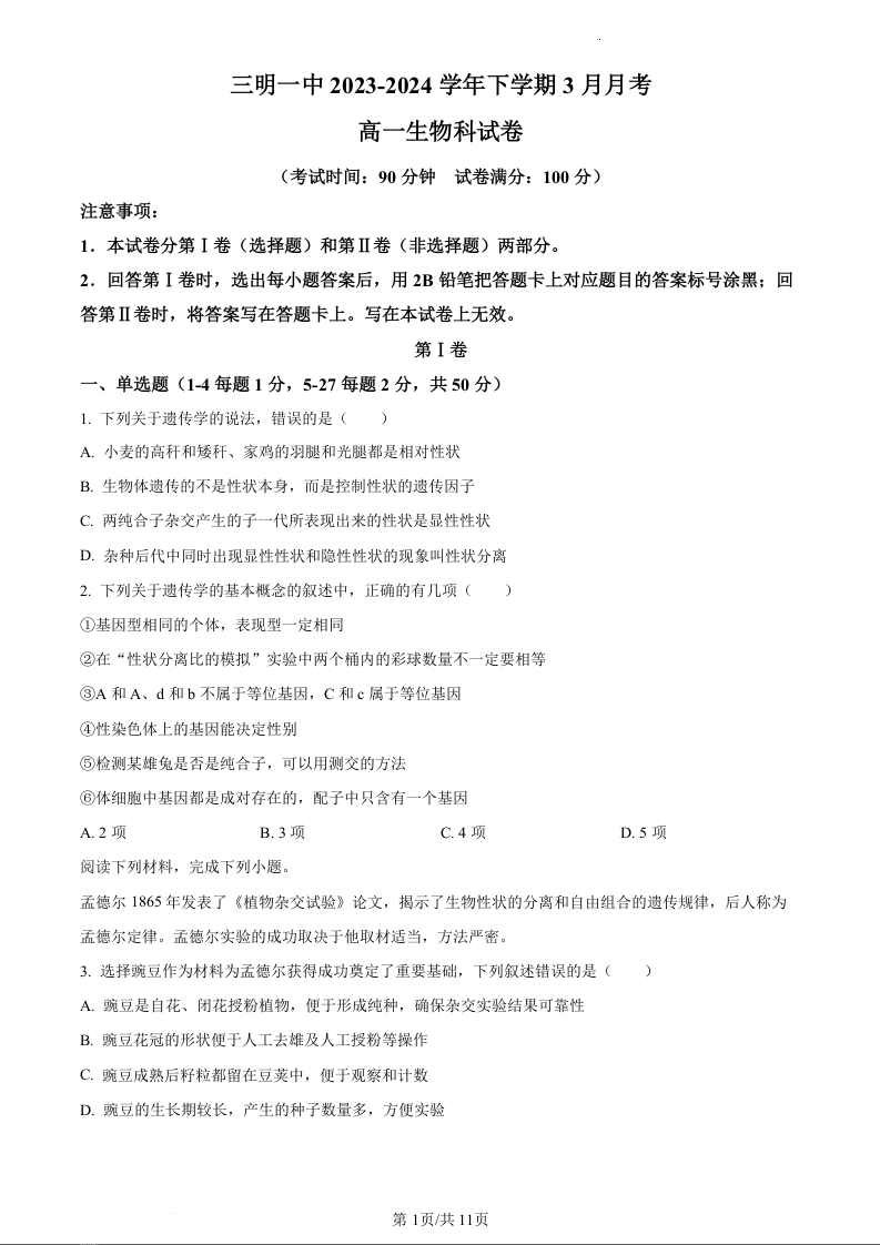 福建省三明市第一中学2023-2024学年高一下学期3月月考生物(原卷版)