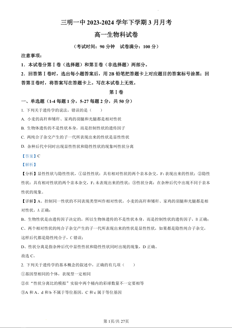 福建省三明市第一中学2023-2024学年高一下学期3月月考生物(精品解析版)