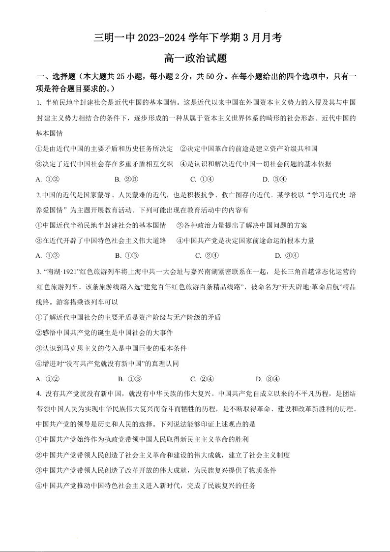 福建省三明市第一中学2023-2024学年高一下学期3月月考政治