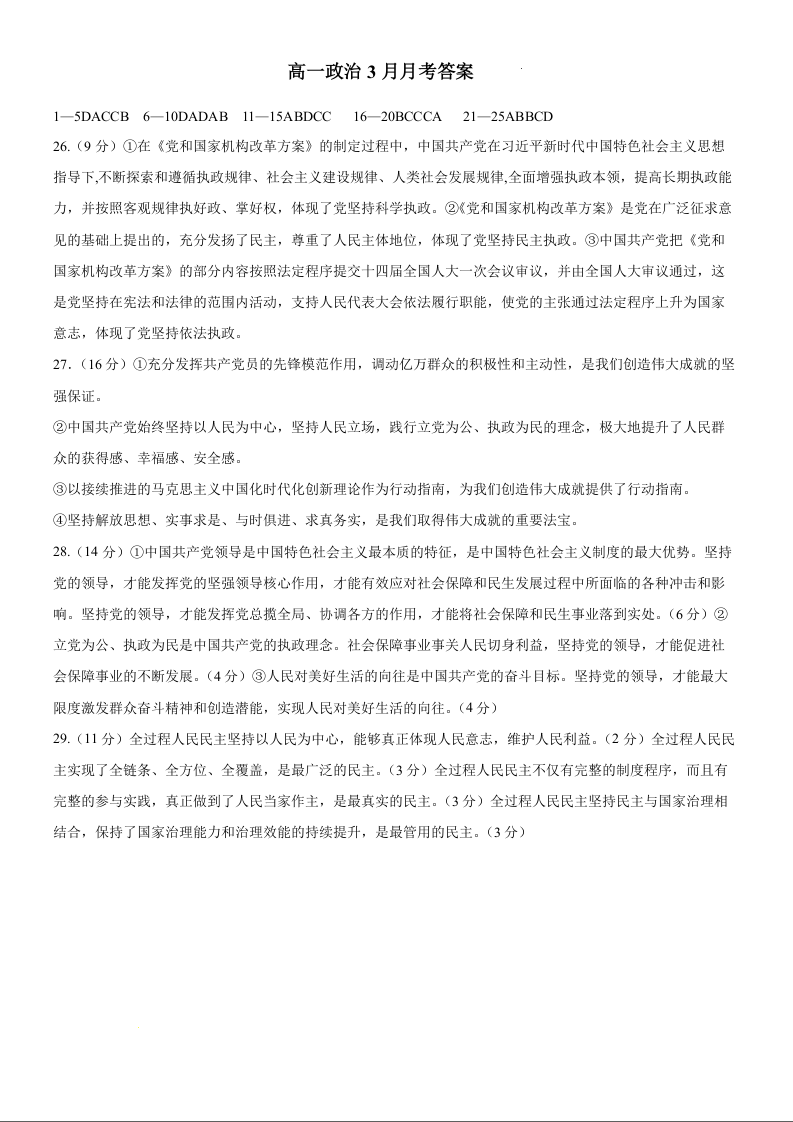 福建省三明市第一中学2023-2024学年高一下学期3月月考政治答案