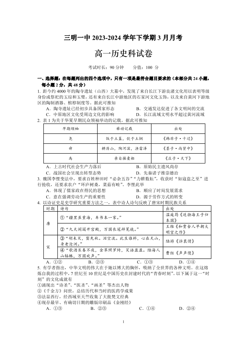 福建省三明市第一中学2023-2024学年高一下学期3月月考历史