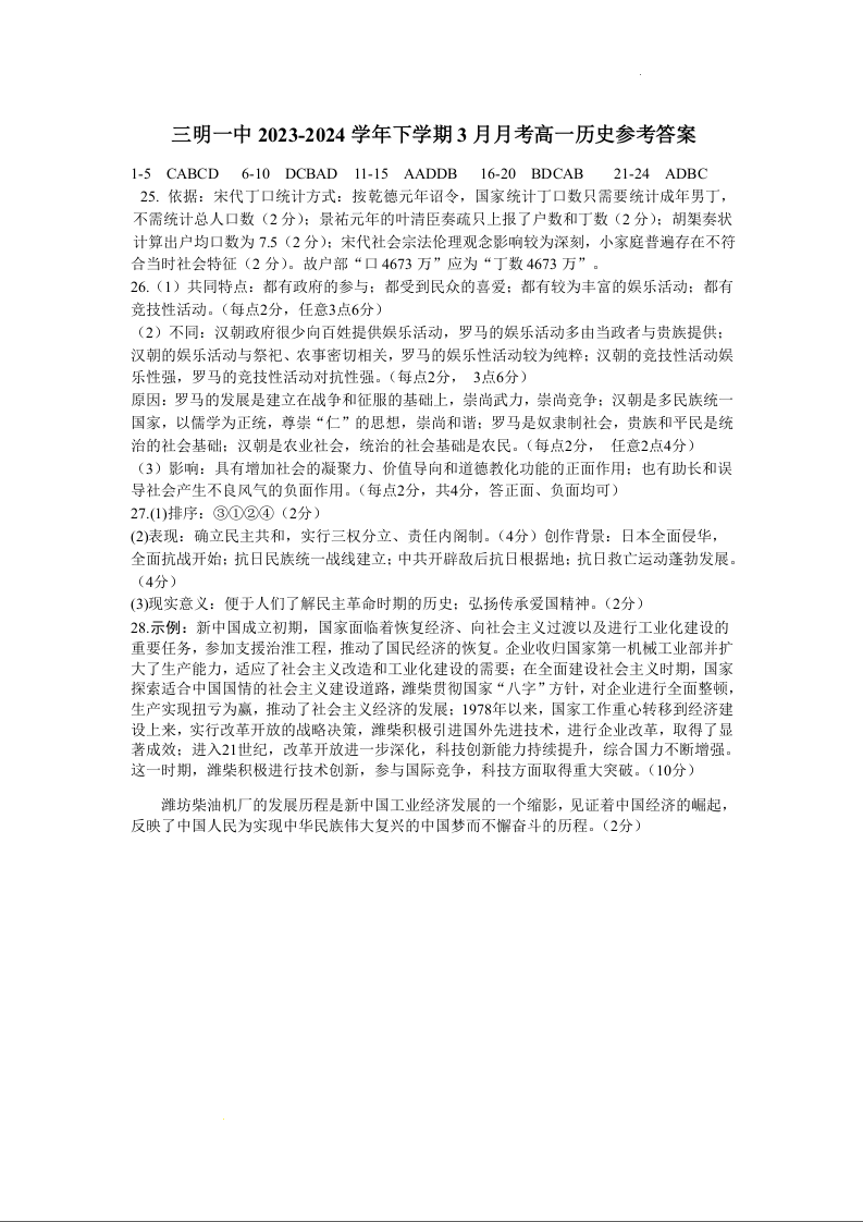 福建省三明市第一中学2023-2024学年高一下学期3月月考历史答案