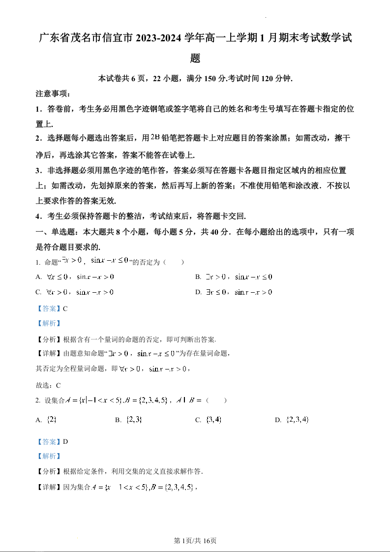 广东省茂名市信宜市2023-2024学年高一上学期1月期末考试数学(精品解析版)
