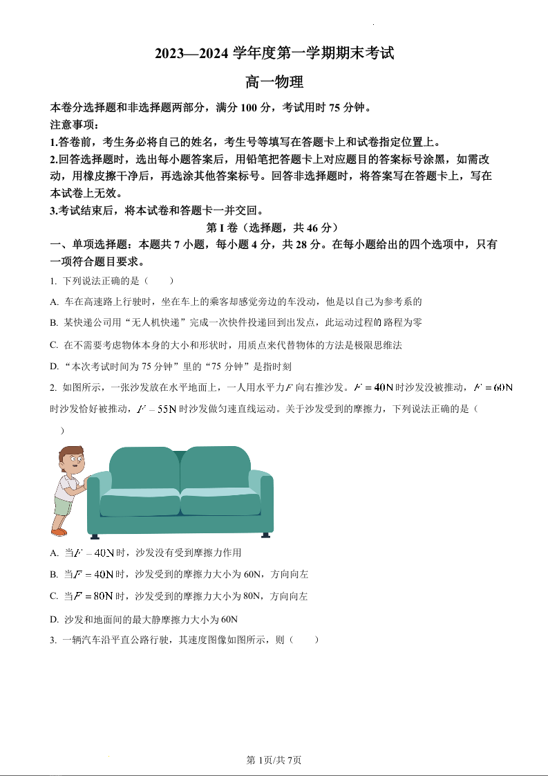 广东省茂名市信宜市2023-2024学年高一上学期1月期末考试物理(原卷版)