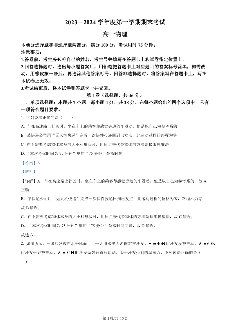 广东省茂名市信宜市2023-2024学年高一上学期1月期末考试物理(精品解析版)