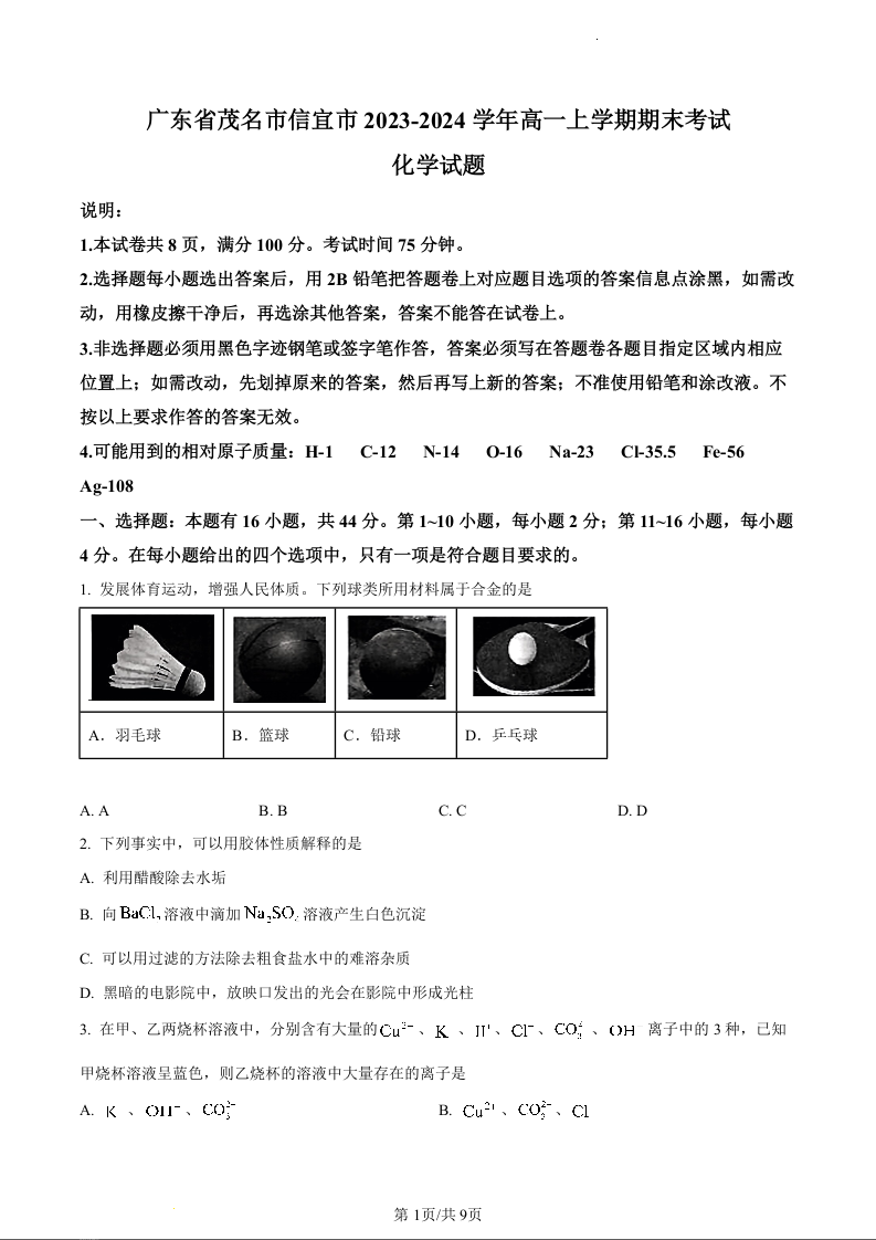 广东省茂名市信宜市2023-2024学年高一上学期1月期末考试化学(原卷版)