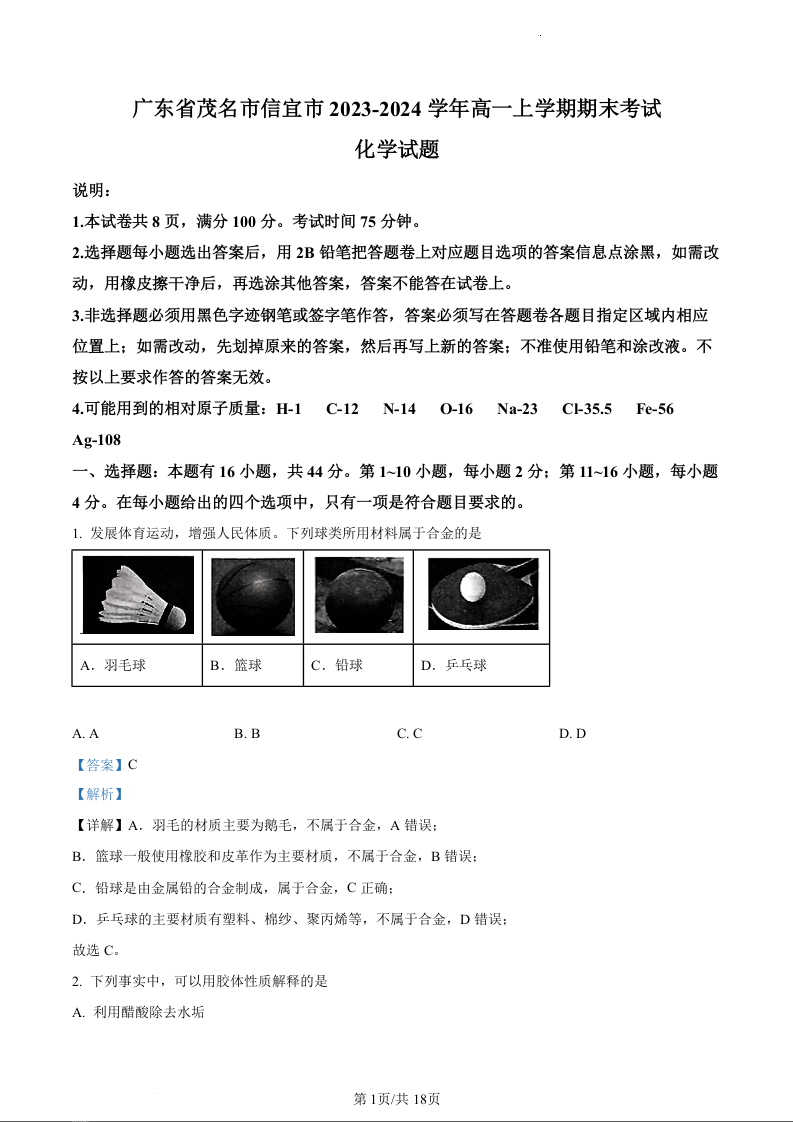 广东省茂名市信宜市2023-2024学年高一上学期1月期末考试化学(精品解析版)
