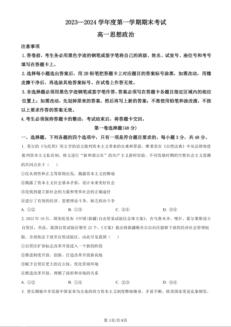 广东省茂名市信宜市2023-2024学年高一上学期1月期末考试政治(原卷版)