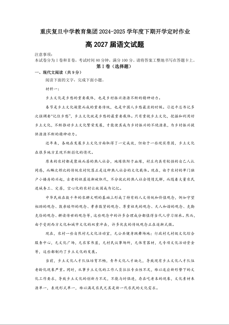 重庆市复旦中学2024-2025学年下学期高一开学定时作业语文