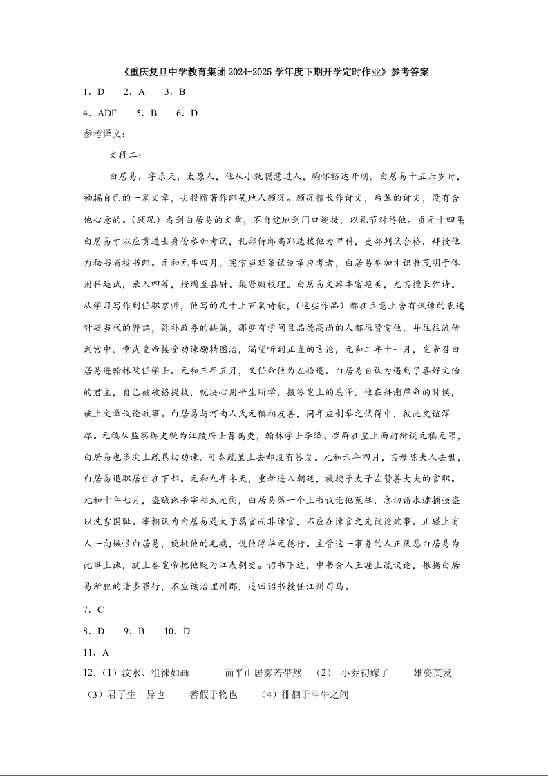 重庆市复旦中学2024-2025学年下学期高一开学定时作业语文答案