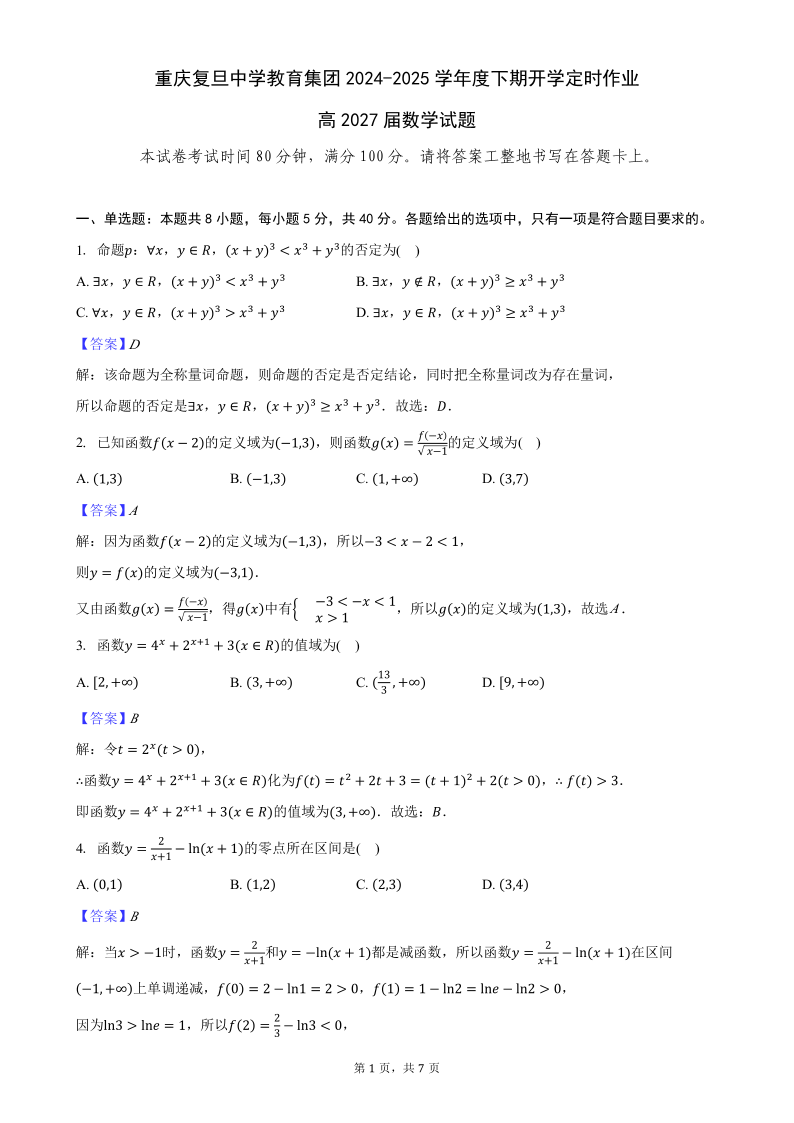 重庆市复旦中学2024-2025学年下学期高一开学定时作业数学(解析版)