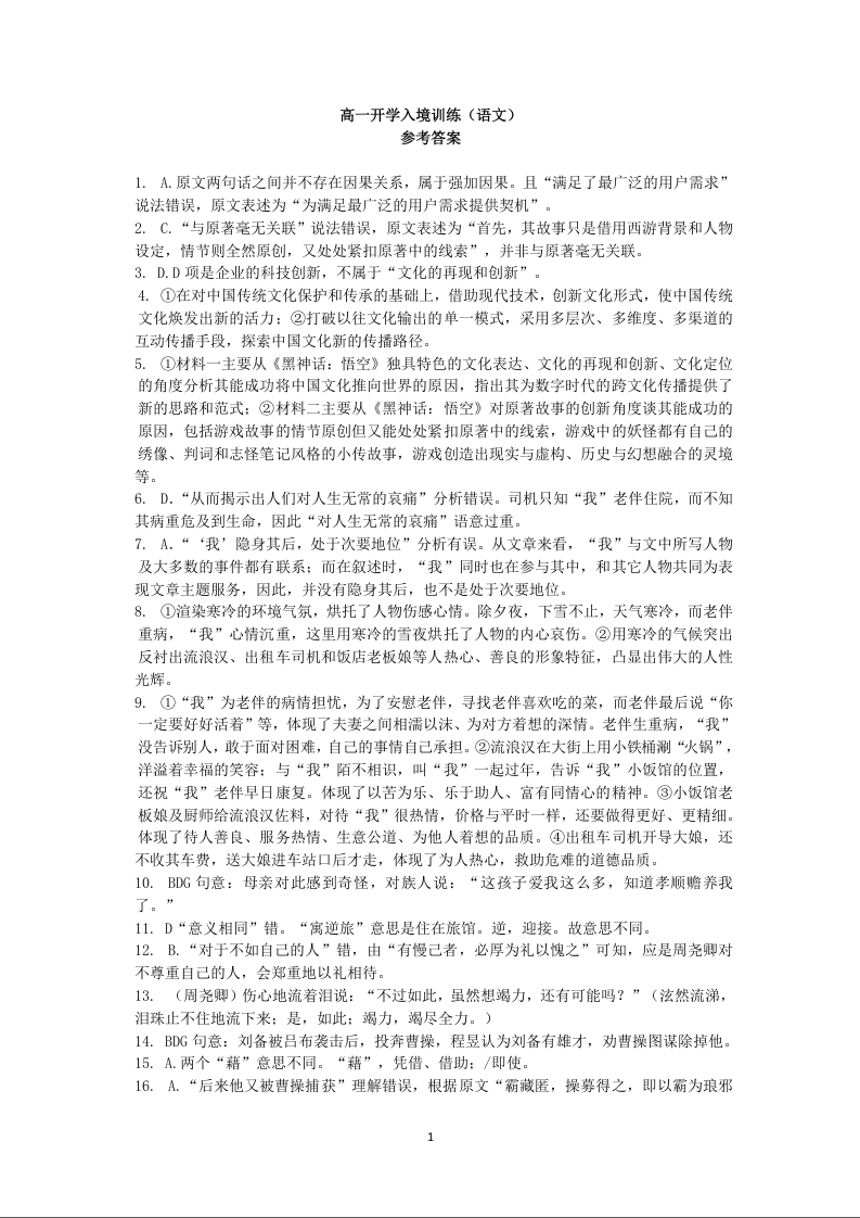 广东省实验中学2024-2025学年下学期2月高一开学考试语文答案