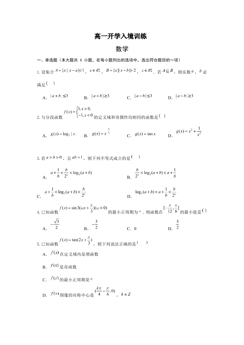 广东省实验中学2024-2025学年下学期2月高一开学考试数学